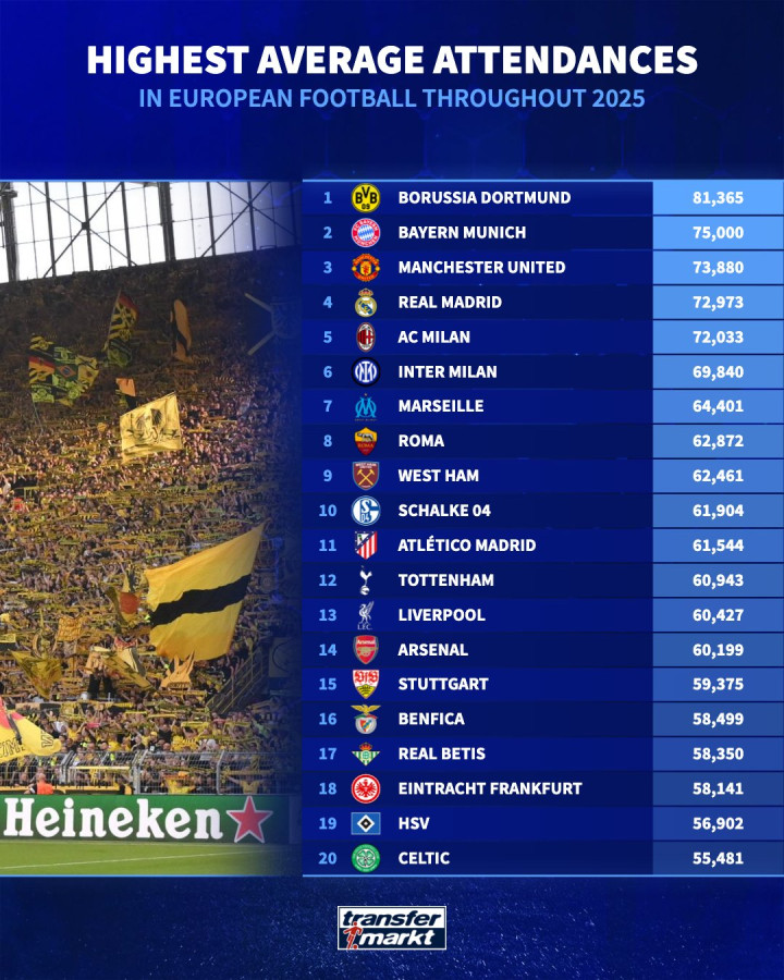 虎扑12月29日讯德国“转会市场”发布了2025年欧洲俱乐部场均上座人数排行榜,德甲豪门多特蒙德以绝对优势荣登榜首,拜仁慕尼黑紧随其后,曼联整个2025年虽然成绩不佳,但依然能平均每场吸引73880名观众到场看球。
