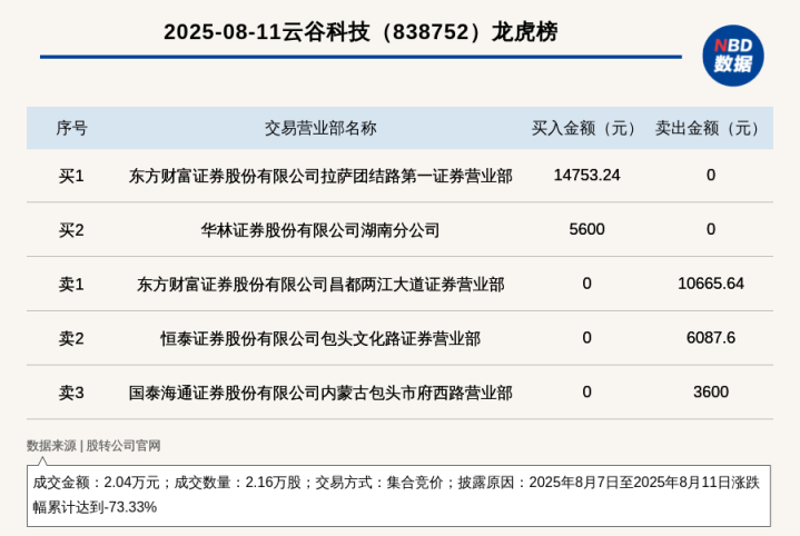 每经讯,2025年8月11日,新三板基础层公司云谷科技(838752,收盘价:0.6元)登上龙虎榜,交易方式是集合竞价,披露原因是2025年8月7日至2025年8月11日涨跌幅累计达到-73.33%,成交数量2.16万股,成交金额2.04万元。买一席位为东方财富证券股份有限公司拉萨团结路第一证券营业部,买入1.48万元;卖一席位为东方财富证券股份有限公司昌都两江大道证券营业部,卖出1.07万元。