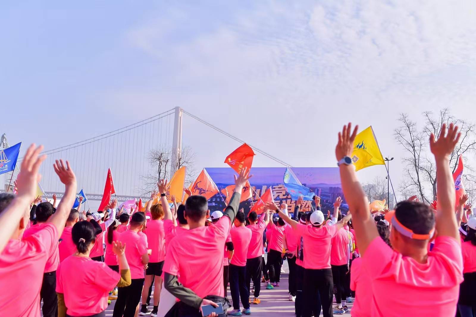 跑者们从落英花园出发,沿途不仅有700株即将盛放的樱花树夹道相迎,还能仰望如长虹卧波的杨泗港大桥,掠过橘红色的荻海栈桥。这座全长460米的栈桥横亘于大草坪之上,蜿蜒似蟒,与远处的桥梁相映成辉,成为跑者们镜头中最美的背景板。