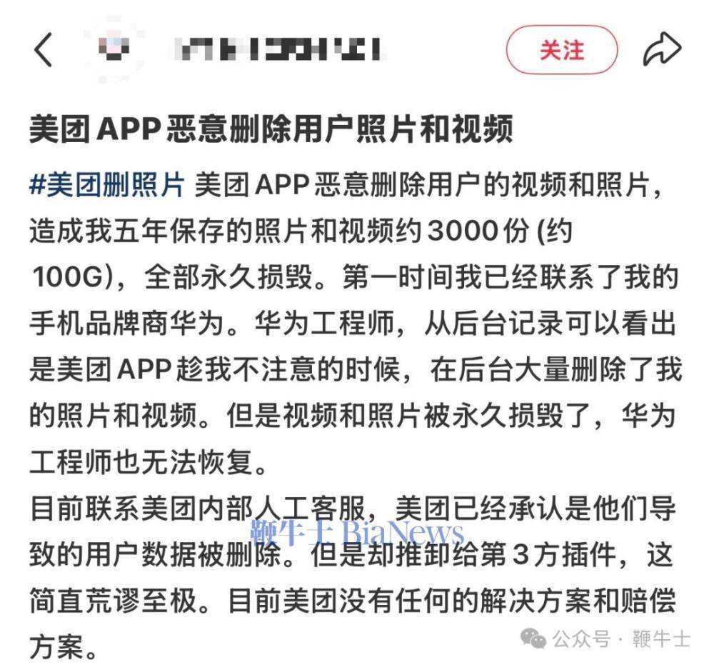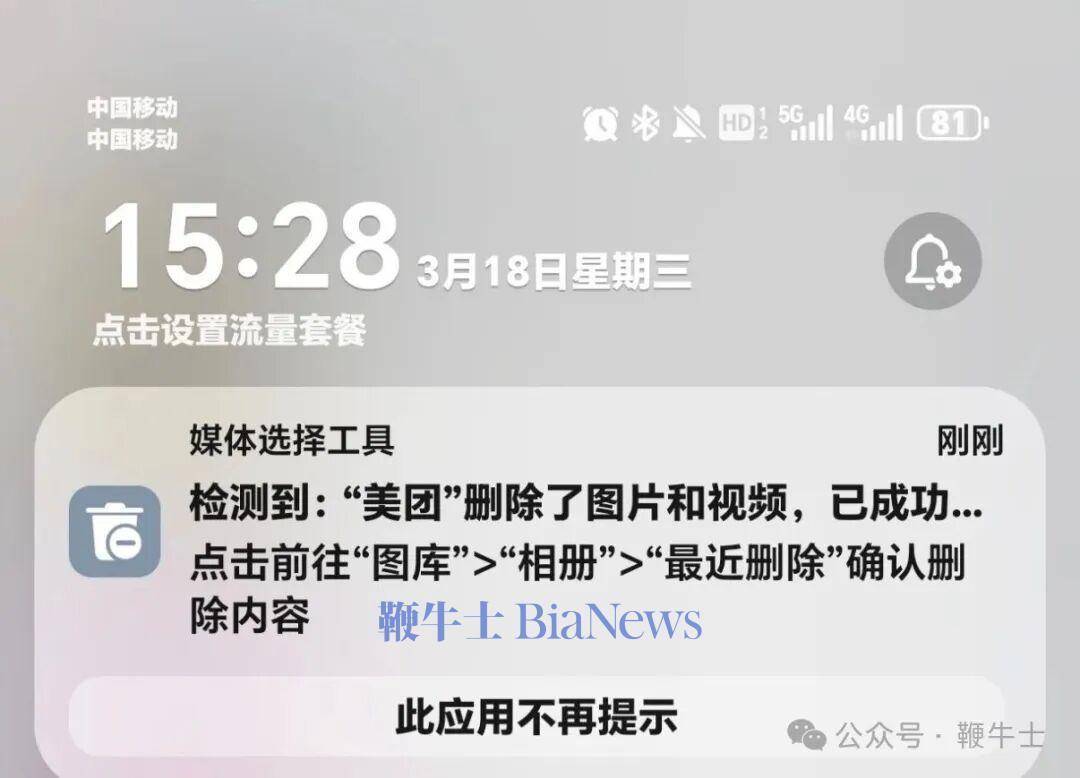 同时,有网友称,自己的手机曾被美团一次性删除上千张照片与视频。并且,该问题并非个例,另有部分安卓手机用户也遇到同类情况。